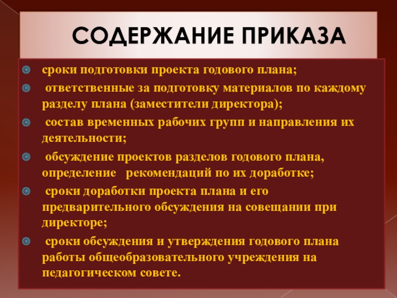 Слайд 9СОДЕРЖАНИЕ ПРИКАЗА