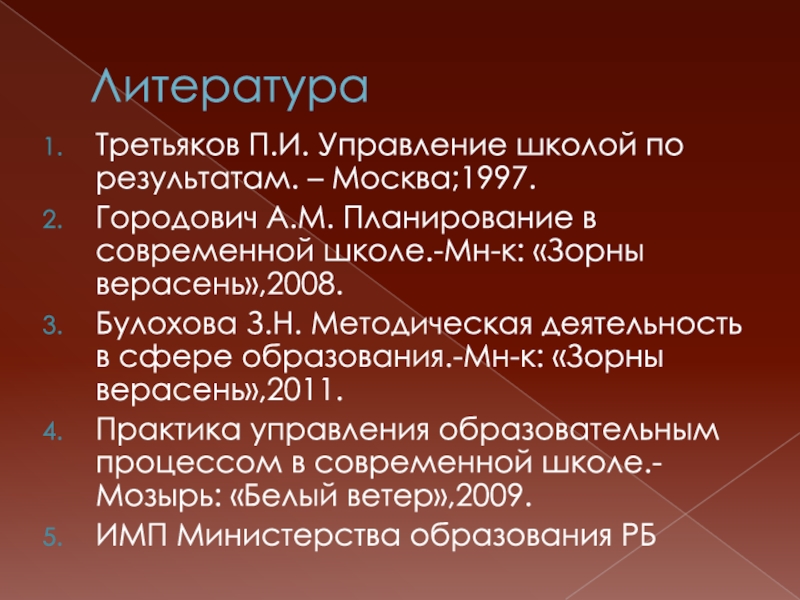 Третьяков П.И. Управление школой по результатам. – Москва;1997.
