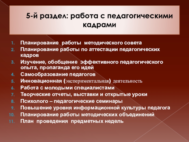 материалы, отражающие эффективность и качество работы с педагогическими кадрами, работу социально-психологической службы, школьной библиотеки, методического кабинета;