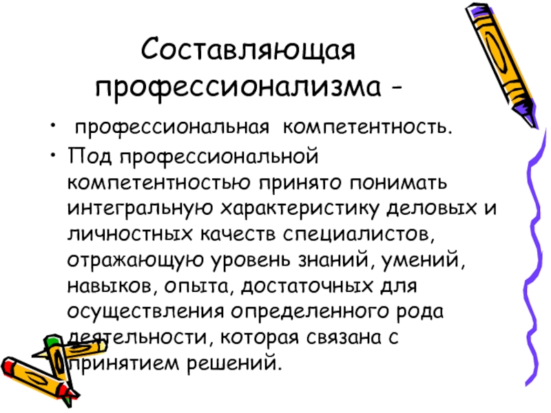 характеристику деловых и личностных качеств специалистов, отражающую уровень знаний, умений, навыков, опыта, достаточных для осуществления определенного рода деятельности, которая связана с принятием решений.