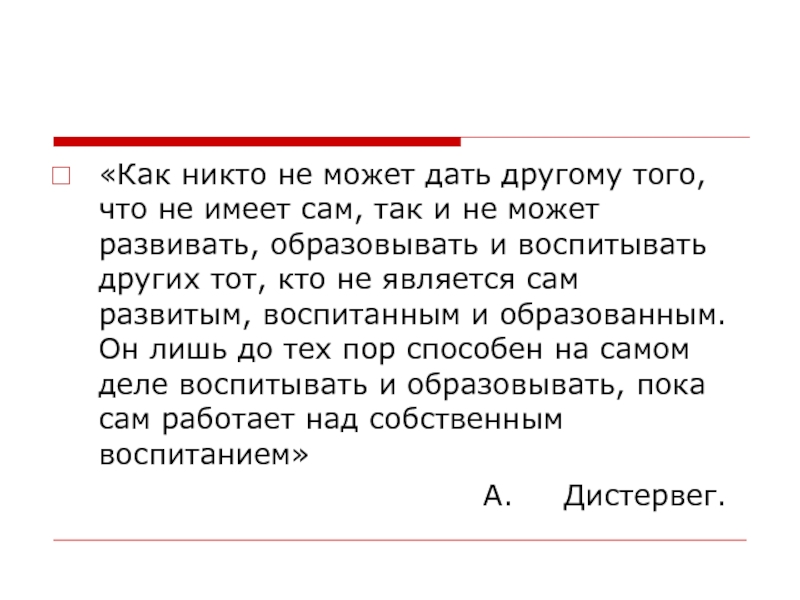 так и не может развивать, образовывать и воспитывать других тот, кто не является сам развитым, воспитанным и образованным. Он лишь до тех пор способен на самом деле воспитывать и образовывать, пока сам работает над собственным воспитанием»