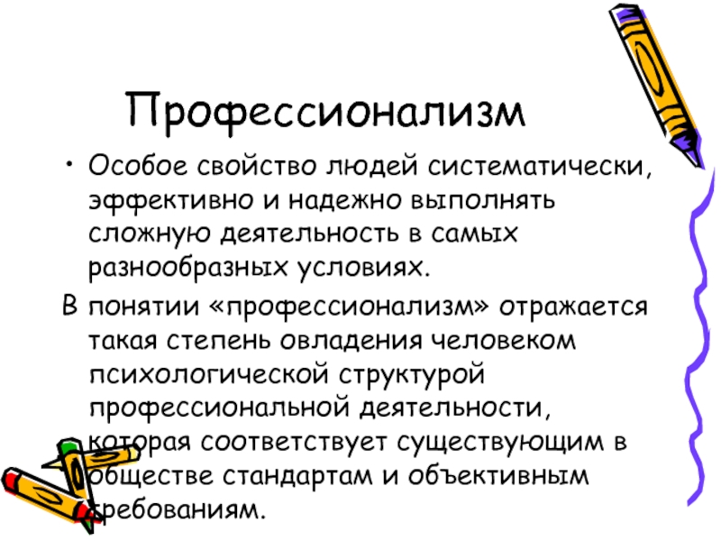 В понятии «профессионализм» отражается такая степень овладения человеком психологической структурой профессиональной деятельности, которая соответствует существующим в обществе стандартам и объективным требованиям.