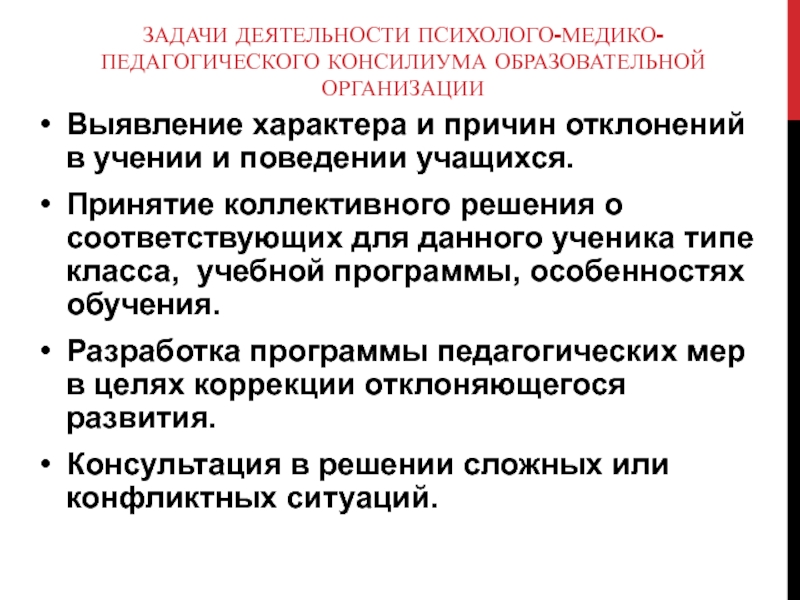 ЗАДАЧИ ДЕЯТЕЛЬНОСТИ ПСИХОЛОГО-МЕДИКО-ПЕДАГОГИЧЕСКОГО КОНСИЛИУМА ОБРАЗОВАТЕЛЬНОЙ ОРГАНИЗАЦИИ