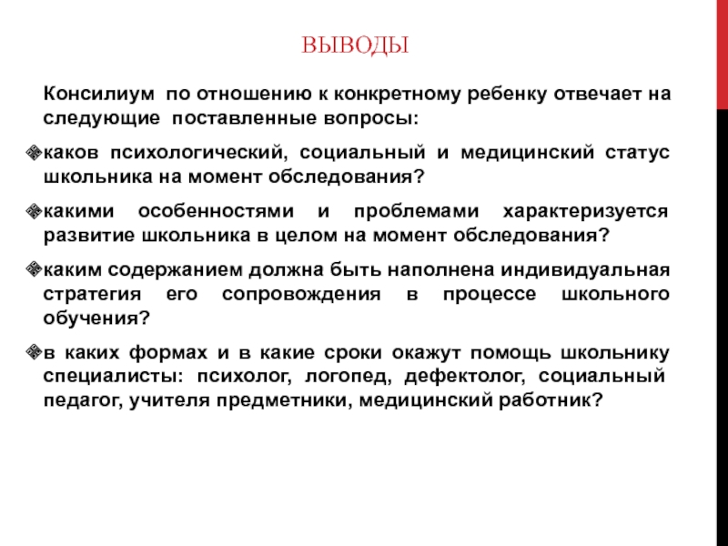Консилиум по отношению к конкретному ребенку отвечает на следующие поставленные вопросы:
