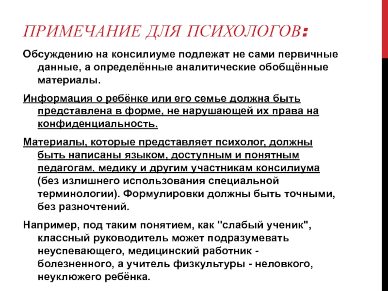 Материалы, которые представляет психолог, должны быть написаны языком, доступным и понятным педагогам, медику и другим участникам консилиума (без излишнего использования специальной терминологии). Формулировки должны быть точными, без разночтений.
