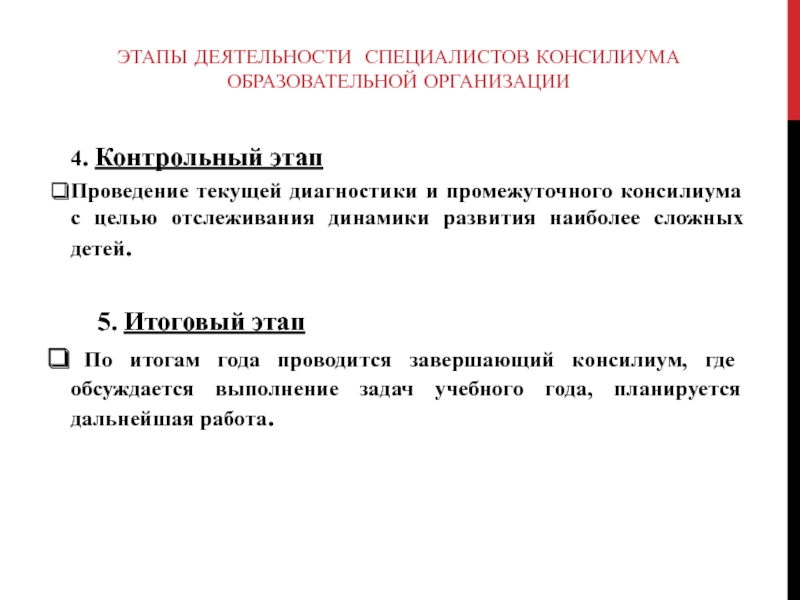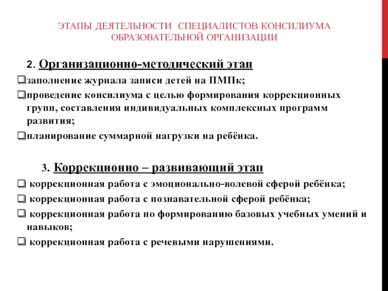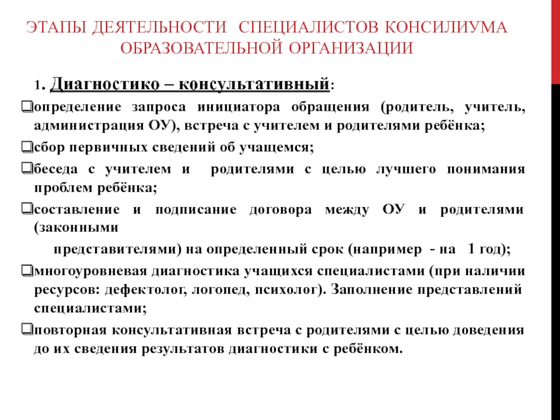 Слайд 18ЭТАПЫ ДЕЯТЕЛЬНОСТИ СПЕЦИАЛИСТОВ КОНСИЛИУМА ОБРАЗОВАТЕЛЬНОЙ ОРГАНИЗАЦИИ