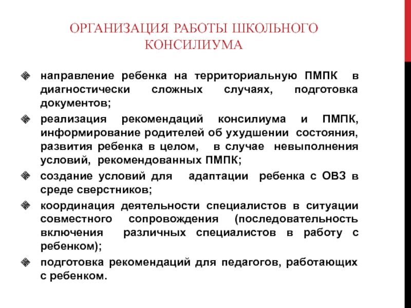 Слайд 5ОРГАНИЗАЦИЯ РАБОТЫ ШКОЛЬНОГО КОНСИЛИУМА