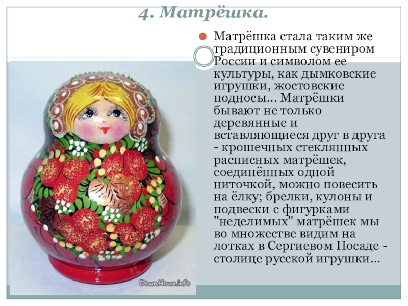 культуры, как дымковские игрушки, жостовские подносы... Матрёшки бывают не только деревянные и вставляющиеся друг в друга - крошечных стеклянных расписных матрёшек, соединённых одной ниточкой, можно повесить на ёлку; брелки, кулоны и подвески с фигурками "неделимых" матрёшек мы во множестве видим на лотках в Сергиевом Посаде - столице русской игрушки…