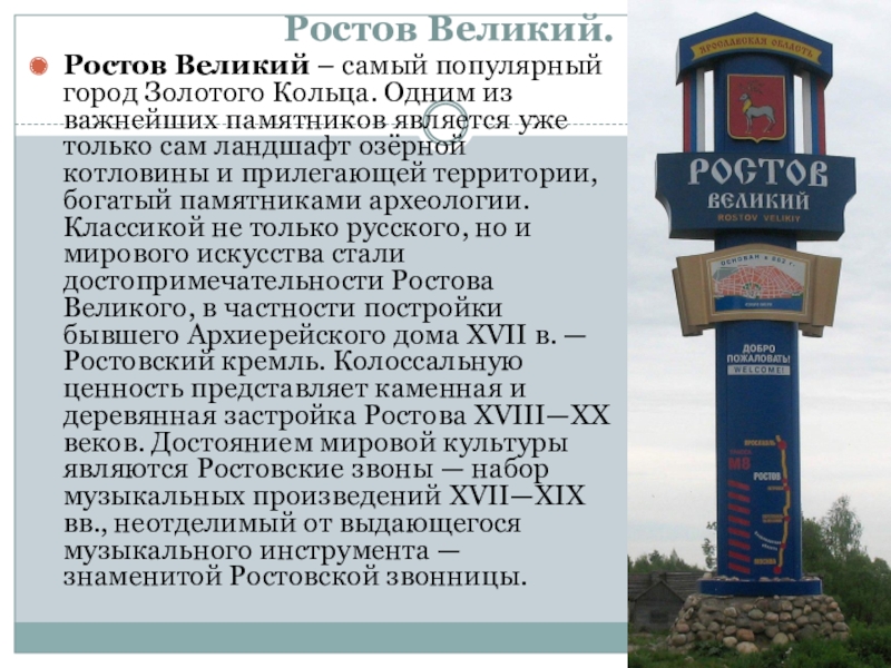 важнейших памятников является уже только сам ландшафт озёрной котловины и прилегающей территории, богатый памятниками археологии. Классикой не только русского, но и мирового искусства стали достопримечательности Ростова Великого, в частности постройки бывшего Архиерейского дома XVII в. — Ростовский кремль. Колоссальную ценность представляет каменная и деревянная застройка Ростова XVIII—XX веков. Достоянием мировой культуры являются Ростовские звоны — набор музыкальных произведений XVII—XIX вв., неотделимый от выдающегося музыкального инструмента — знаменитой Ростовской звонницы.