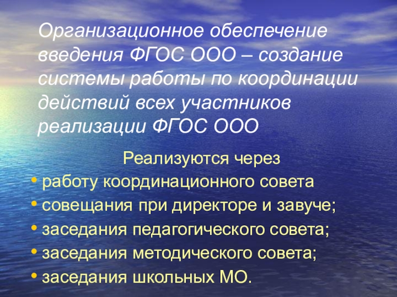 Слайд 26Организационное обеспечение введения ФГОС ООО – создание системы работы по координации