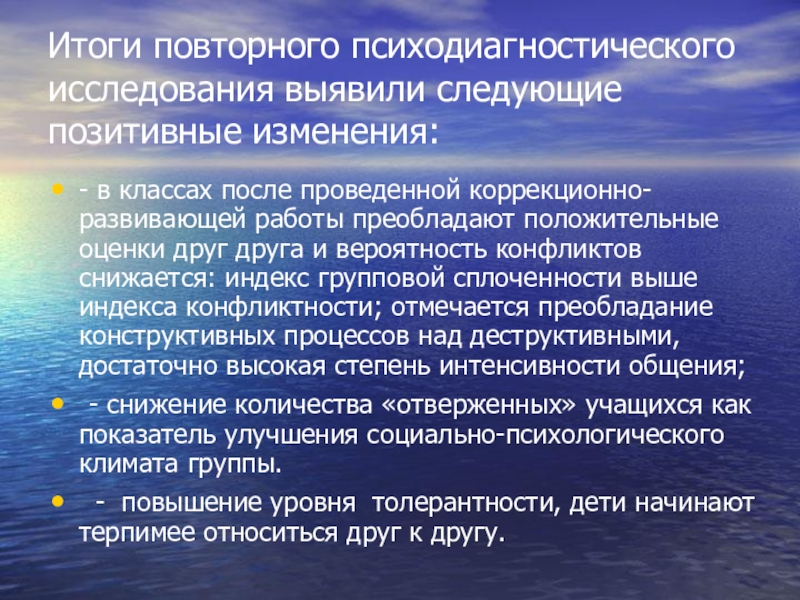 Слайд 18Итоги повторного психодиагностического исследования выявили следующие позитивные изменения: