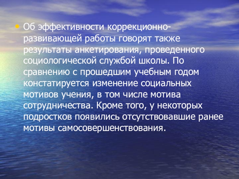 школы. По сравнению с прошедшим учебным годом констатируется изменение социальных мотивов учения, в том числе мотива сотрудничества. Кроме того, у некоторых подростков появились отсутствовавшие ранее мотивы самосовершенствования.