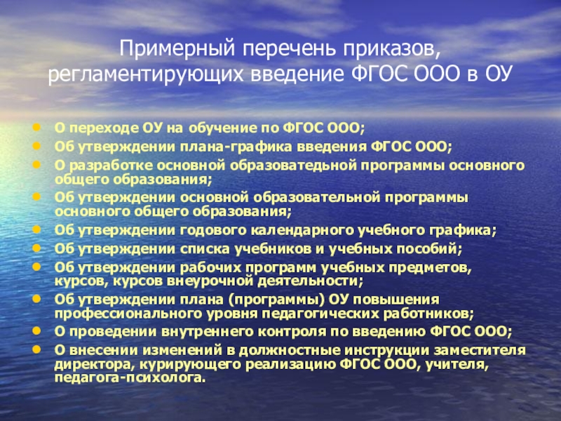 Слайд 29Примерный перечень приказов, регламентирующих введение ФГОС ООО в ОУ