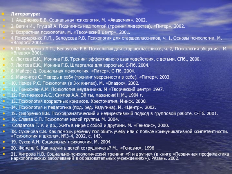 1. Андриенко Е.В. Социальная психология. М. «Академия». 2002.