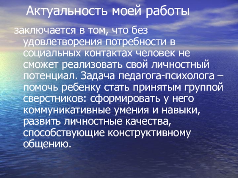социальных контактах человек не сможет реализовать свой личностный потенциал. Задача педагога-психолога – помочь ребенку стать принятым группой сверстников: сформировать у него коммуникативные умения и навыки, развить личностные качества, способствующие конструктивному общению.