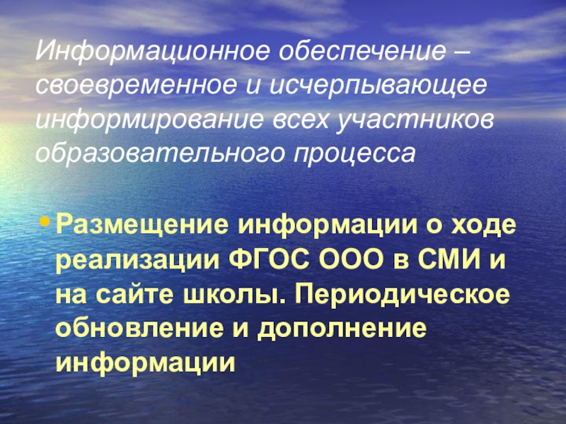 Слайд 30Информационное обеспечение – своевременное и исчерпывающее информирование всех участников образовательного процесса