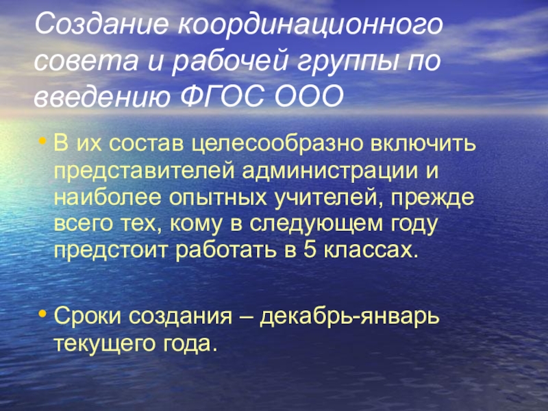 Слайд 23Создание координационного совета и рабочей группы по введению ФГОС ООО