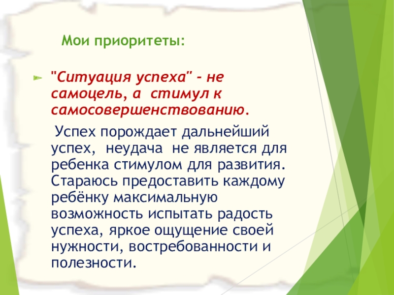 Успех порождает дальнейший успех, неудача не является для ребенка стимулом для развития. Стараюсь предоставить каждому ребёнку максимальную возможность испытать радость успеха, яркое ощущение своей нужности, востребованности и полезности.