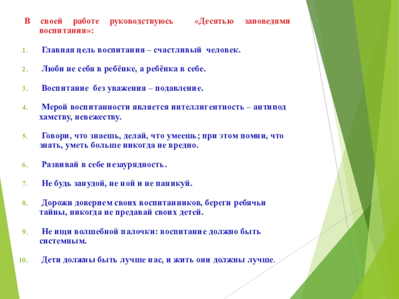 Слайд 4В своей работе руководствуюсь «Десятью заповедями воспитания»: