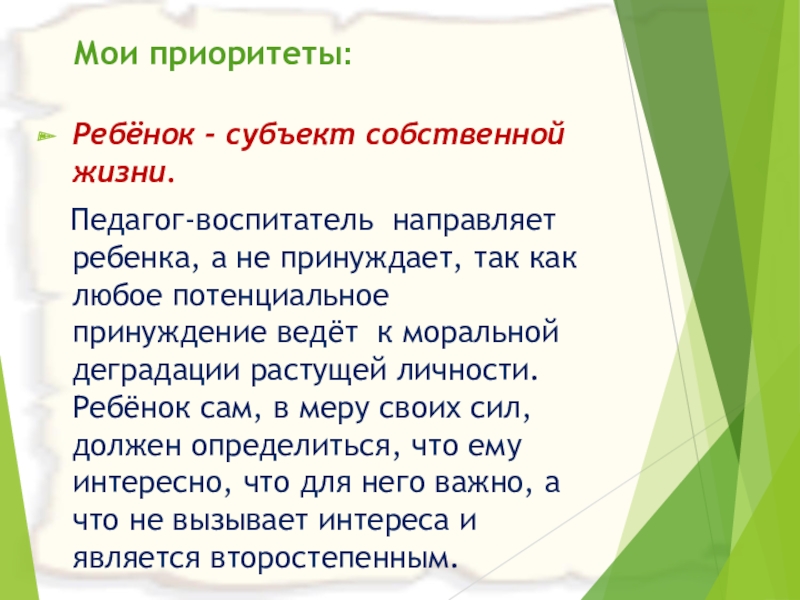 а не принуждает, так как любое потенциальное принуждение ведёт к моральной деградации растущей личности. Ребёнок сам, в меру своих сил, должен определиться, что ему интересно, что для него важно, а что не вызывает интереса и является второстепенным.