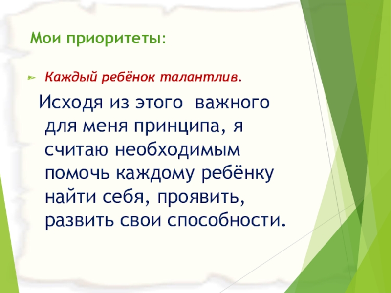 меня принципа, я считаю необходимым помочь каждому ребёнку найти себя, проявить, развить свои способности.
