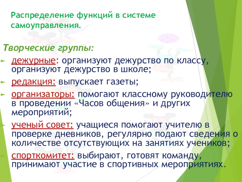 организаторы: помогают классному руководителю в проведении «Часов общения» и других мероприятий;