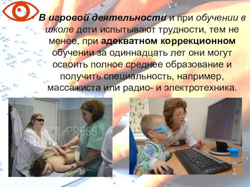 при адекватном коррекционном обучении за одиннадцать лет они могут освоить полное среднее образование и получить специальность, например, массажиста или радио- и электротехника.