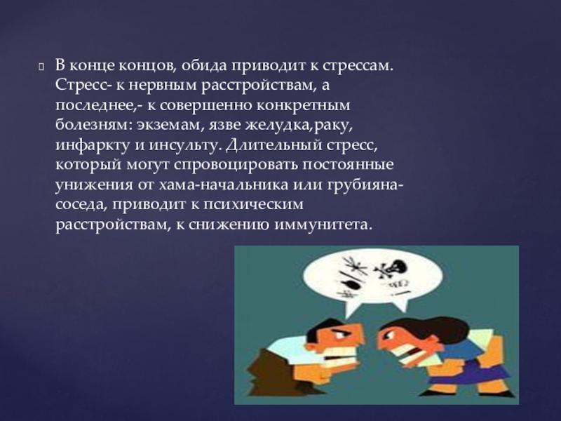 Слайд 15В конце концов, обида приводит к стрессам. Стресс- к нервным расстройствам,