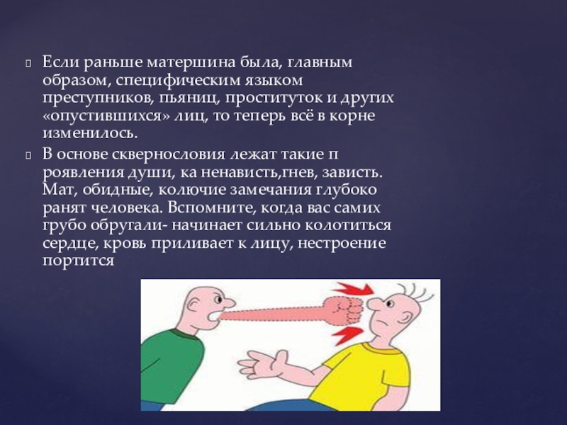 В основе сквернословия лежат такие п роявления души, ка ненависть,гнев, зависть.Мат, обидные, колючие замечания глубоко ранят человека. Вспомните, когда вас самих грубо обругали- начинает сильно колотиться сердце, кровь приливает к лицу, нестроение портится