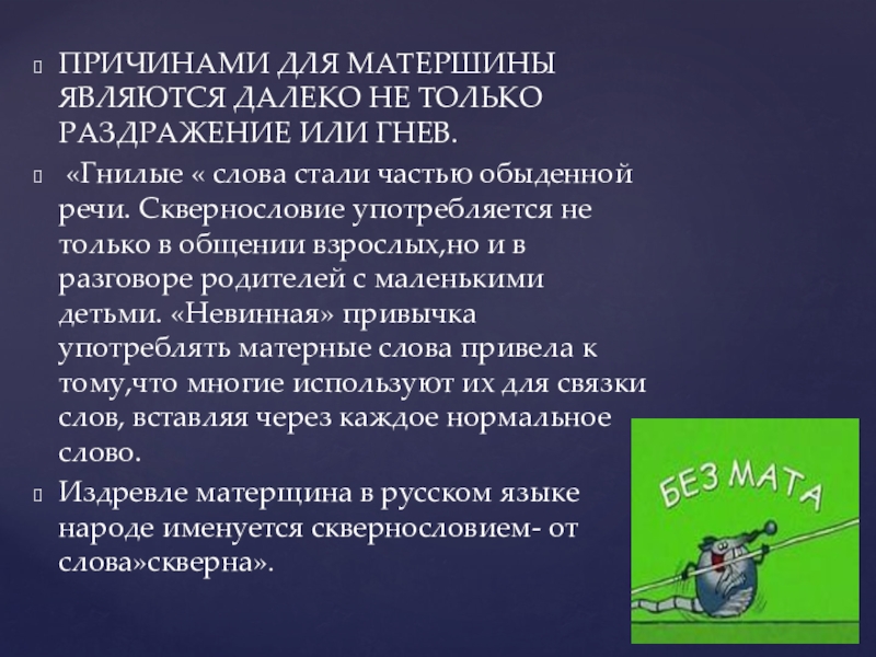 Слайд 12ПРИЧИНАМИ ДЛЯ МАТЕРШИНЫ ЯВЛЯЮТСЯ ДАЛЕКО НЕ ТОЛЬКО РАЗДРАЖЕНИЕ ИЛИ ГНЕВ.