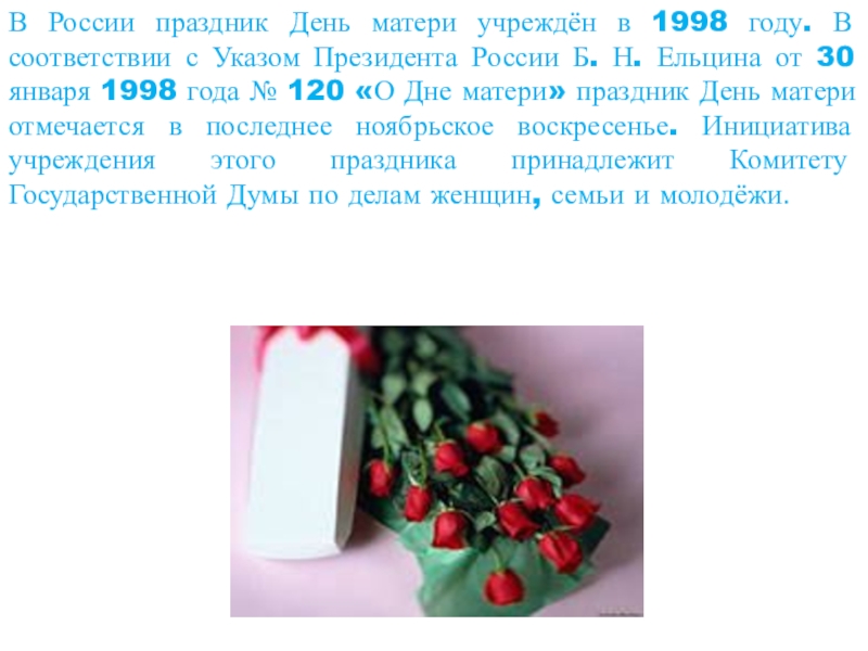 Слайд 6В России праздник День матери учреждён в 1998 году. В соответствии