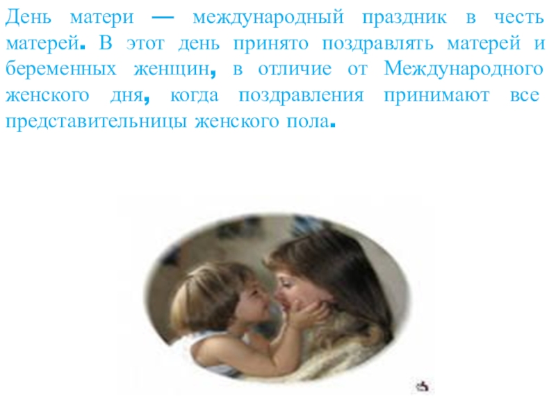 Слайд 2День матери — международный праздник в честь матерей. В этот день