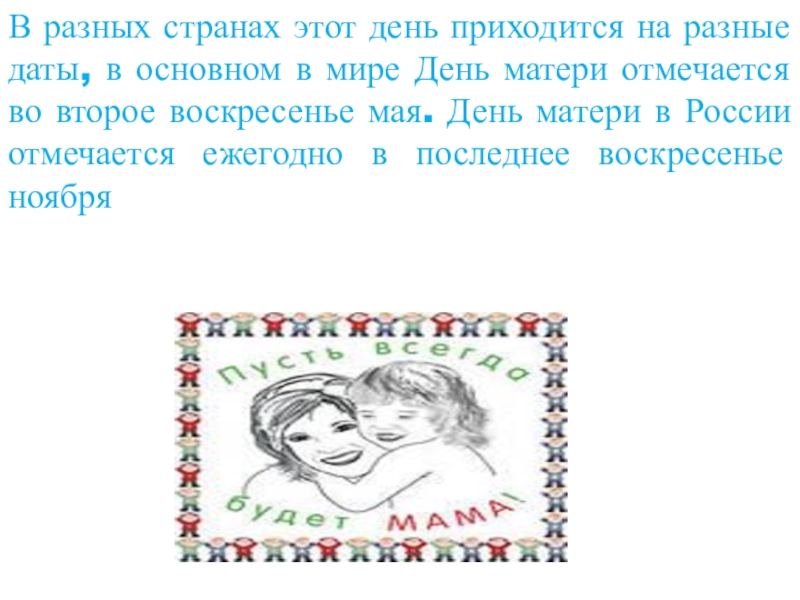 В разных странах этот день приходится на разные даты, в основном в мире День матери отмечается во
