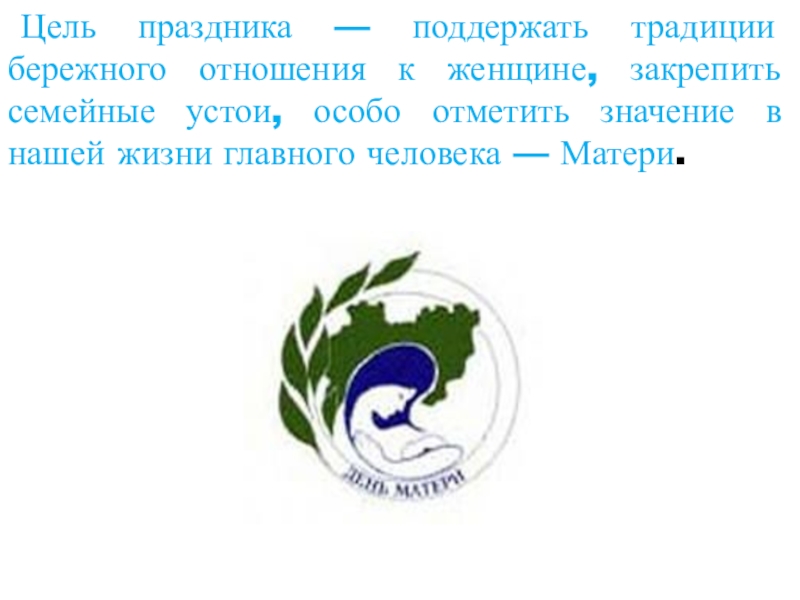 Слайд 10 Цель праздника — поддержать традиции бережного отношения к женщине, закрепить