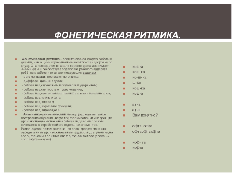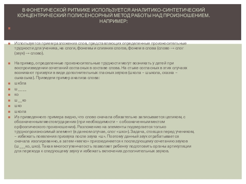 В ФОНЕТИЧЕСКОЙ РИТМИКЕ ИСПОЛЬЗУЕТСЯ АНАЛИТИКО-СИНТЕТИЧЕСКИЙ КОНЦЕНТРИЧЕСКИЙ ПОЛИСЕНСОРНЫЙ МЕТОД РАБОТЫ НАД ПРОИЗНОШЕНИЕМ. НАПРИМЕР: