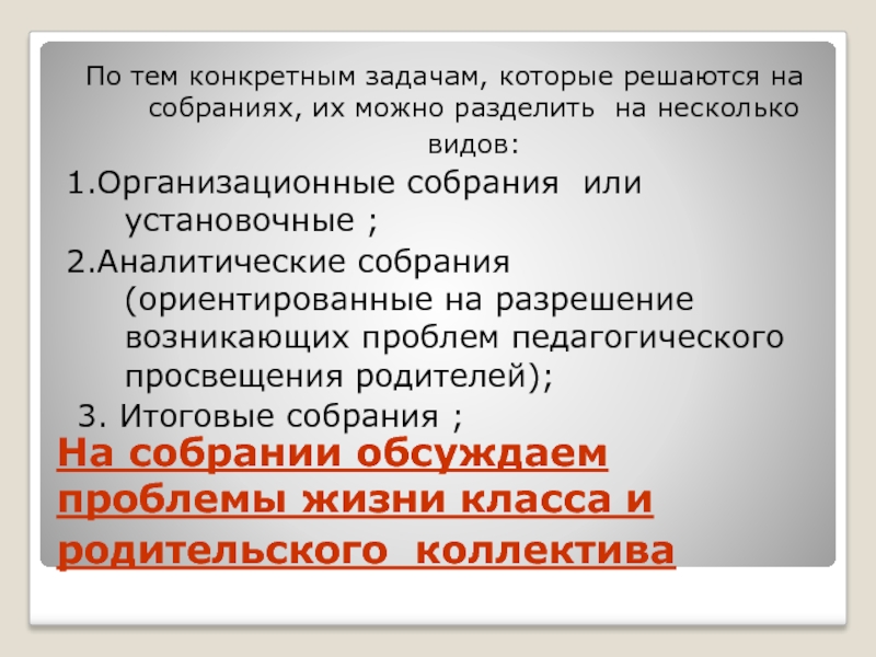 родительское собрание не должно быть длительным, главным в его содержании является четкость, лаконичность, системность;