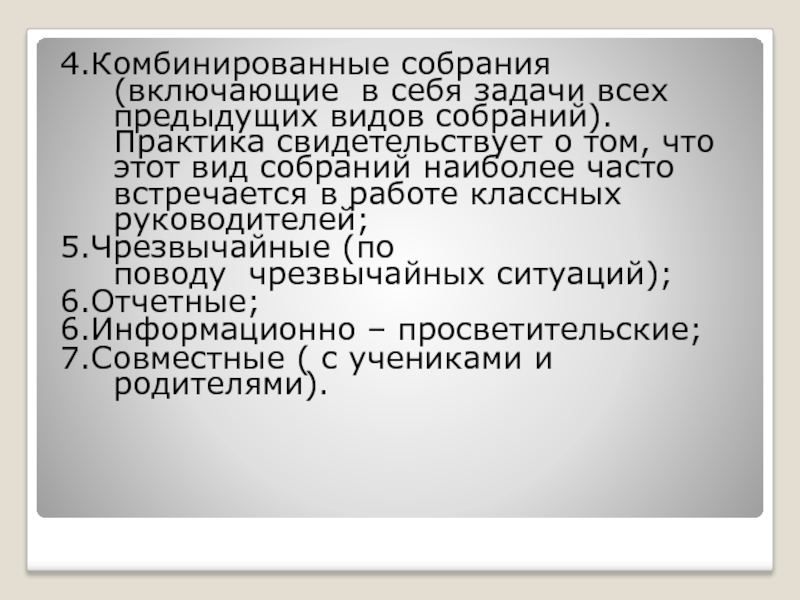 4.Комбинированные собрания (включающие в себя задачи всех предыдущих видов собраний). Практика