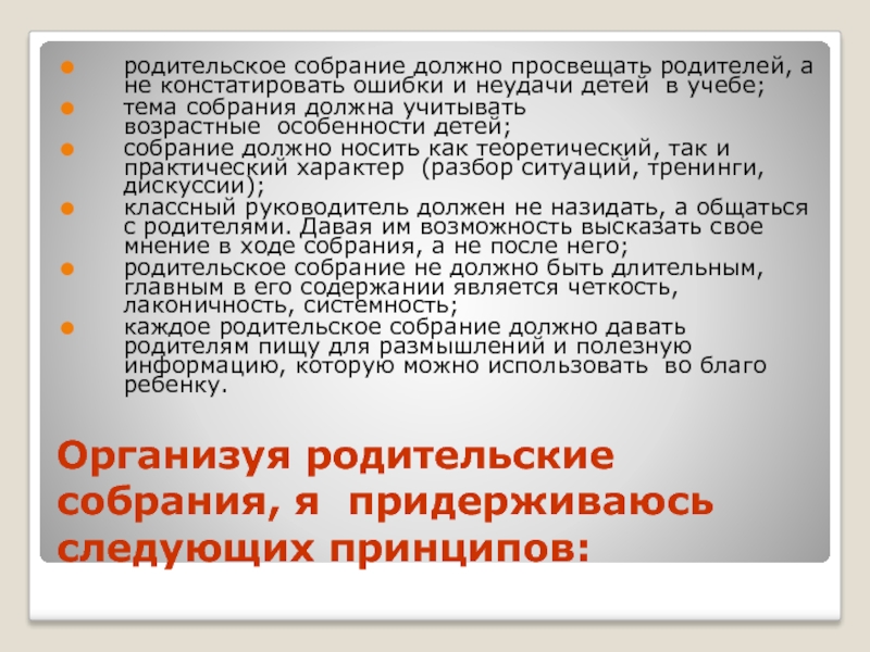 Слайд 2Организуя родительские собрания, я придерживаюсь следующих принципов: