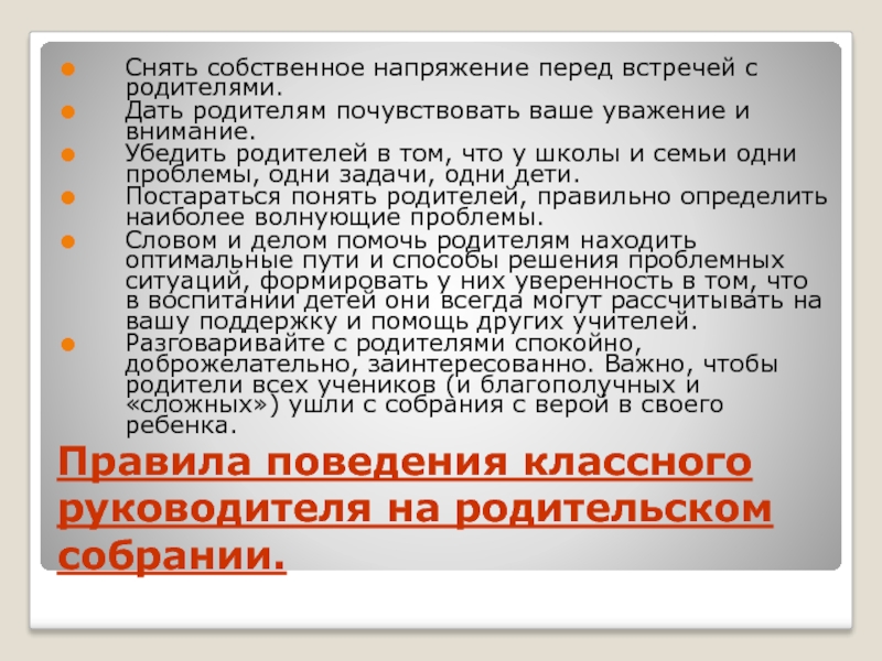 Слайд 11Правила поведения классного руководителя на родительском собрании.