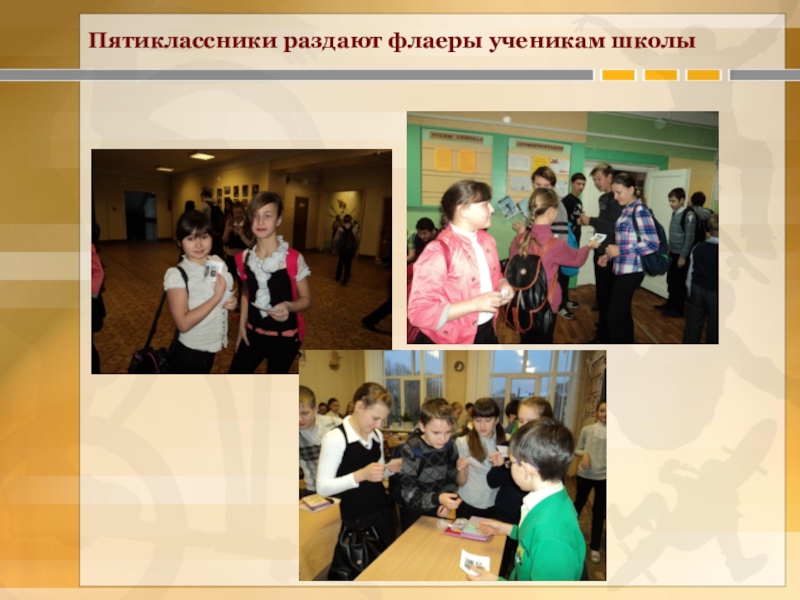 Слайд 11Пятиклассники раздают флаеры ученикам школы
