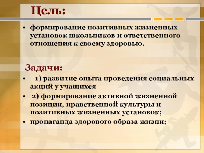 Цель: формирование позитивных жизненных установок школьников и ответственного отношения к своему здоровью.  Задачи: