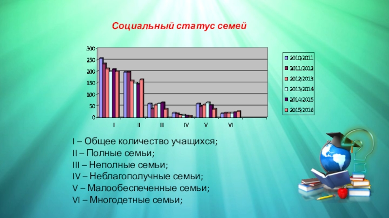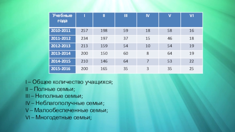 I – Общее количество учащихся;II – Полные семьи;III – Неполные семьи;IV – Неблагополучные семьи;V – Малообеспеченные семьи;VI