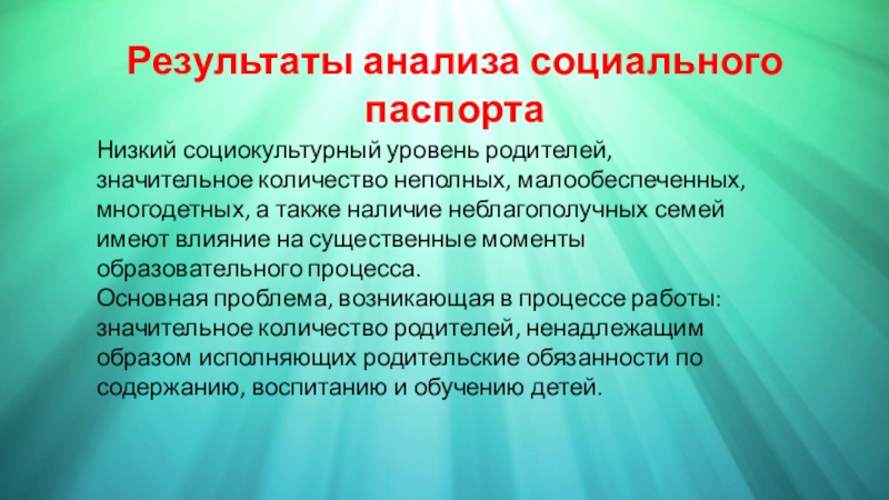 Результаты анализа социального паспортаНизкий социокультурный уровень родителей, значительное количество неполных, малообеспеченных, многодетных, а также наличие неблагополучных семей
