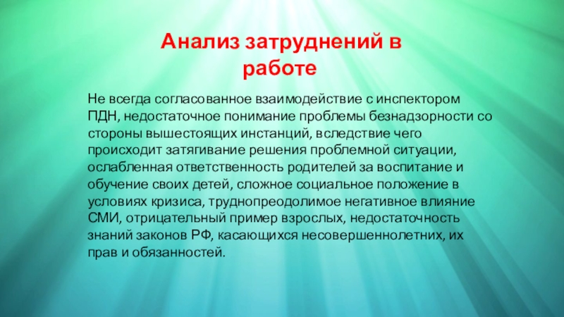 ПДН, недостаточное понимание проблемы безнадзорности со стороны вышестоящих инстанций, вследствие чего происходит затягивание решения проблемной ситуации, ослабленная ответственность родителей за воспитание и обучение своих детей, сложное социальное положение в условиях кризиса, труднопреодолимое негативное влияние СМИ, отрицательный пример взрослых, недостаточность знаний законов РФ, касающихся несовершеннолетних, их прав и обязанностей.