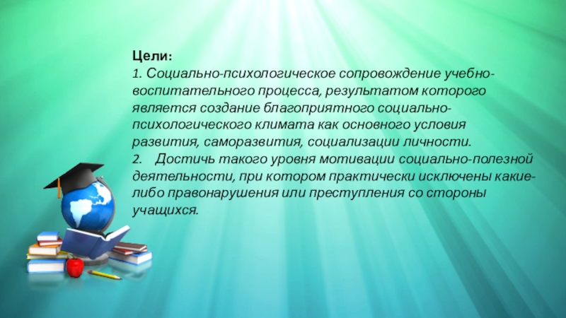 Цели: 1. Социально-психологическое сопровождение учебно-воспитательного процесса, результатом которого является создание благоприятного социально-психологического климата как основного условия развития, саморазвития, социализации личности.2.    Достичь такого уровня мотивации социально-полезной деятельности, при котором практически исключены какие-либо правонарушения или преступления со стороны учащихся.