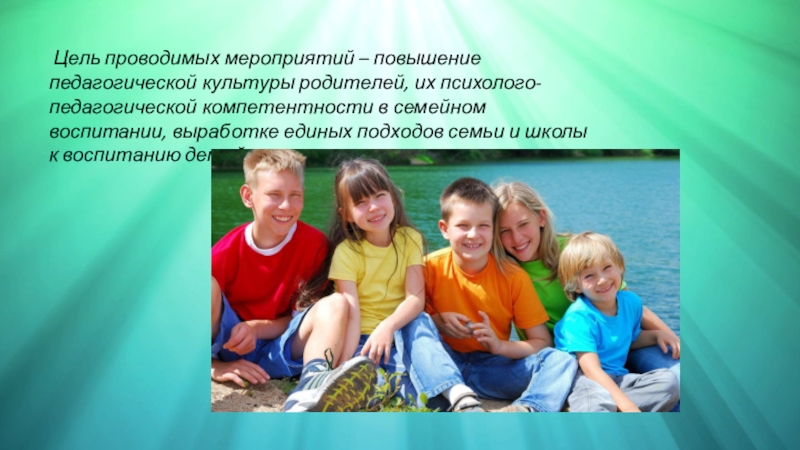 Слайд 8 Цель проводимых мероприятий – повышение педагогической культуры родителей, их психолого-педагогической