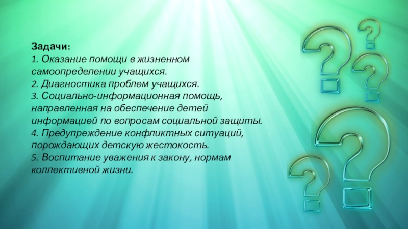 Задачи:1. Оказание помощи в жизненном  самоопределении учащихся.2. Диагностика проблем учащихся.3. Социально-информационная помощь, направленная на обеспечение детей информацией
