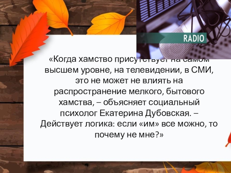 Слайд 13«Когда хамство присутствует на самом высшем уровне, на телевидении, в СМИ,
