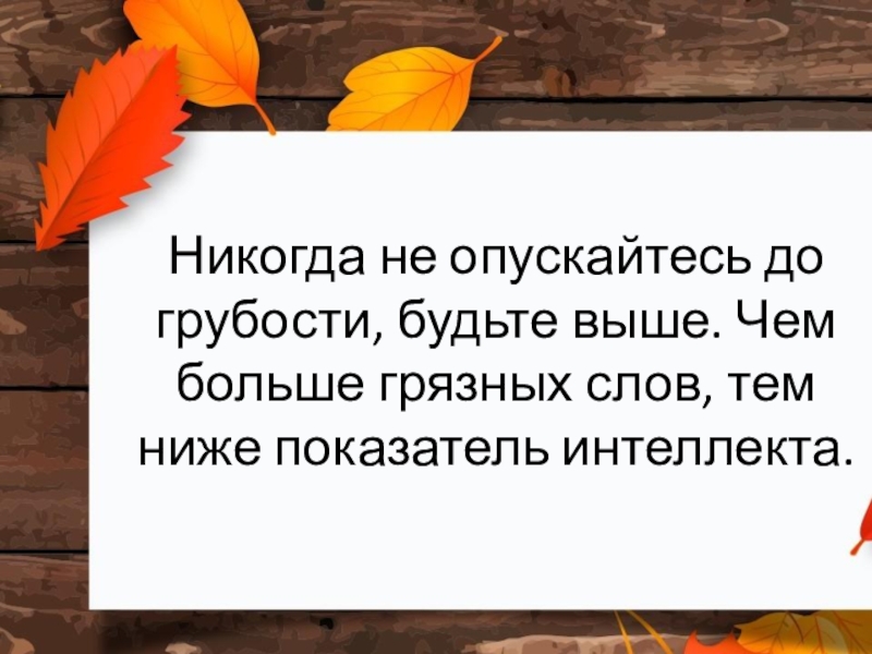 Слайд 2Никогда не опускайтесь до грубости, будьте выше. Чем больше грязных слов,
