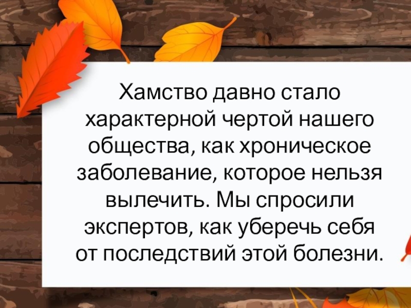 Слайд 8Хамство давно стало характерной чертой нашего общества, как хроническое заболевание, которое